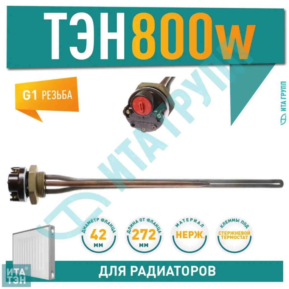 Комплект ТЭН для чугунной батареи отопления (радиатора) 800 Вт, нерж, D42, G1 1/4", L272мм, 220V, с терморегулятором, ИТАТЭН, 24065K